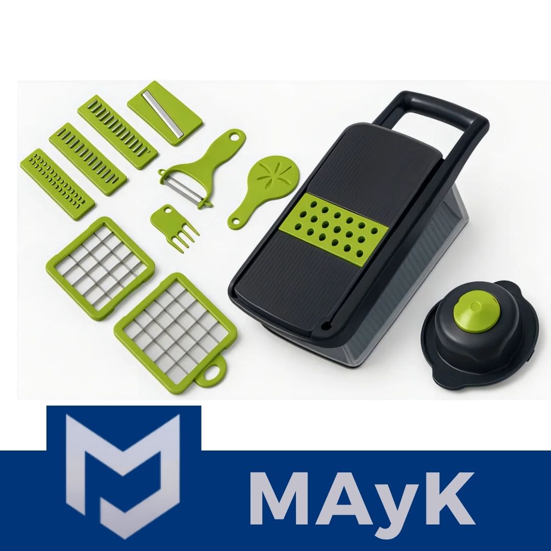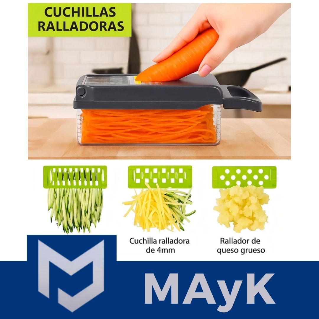 Fabricada en PVC reforzado de alta resistencia, incluye 7 cuchillas intercambiables de acero inoxidable, además de un práctico colador escurridor, táper contenedor y separador de yema. Todo en un diseño compacto, funcional y fácil de limpiar.